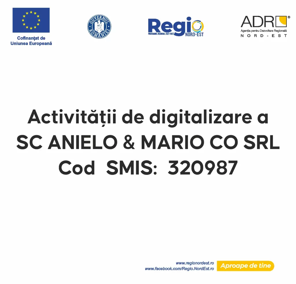 Obiectivul general al proiectului este creșterea nivelului de digitalizare prin valorificarea avantajelor digitalizării activității societății ANIELO & MARIO CO SRL în beneficiul clienților, prin atingerea unui nivel ridicat de intensitate digitală, ca urmare a realizării de investiții în active corporale și necorporale în domeniul de activitate specific, pentru utilizarea de instrumente, echipamente și servicii digitale.